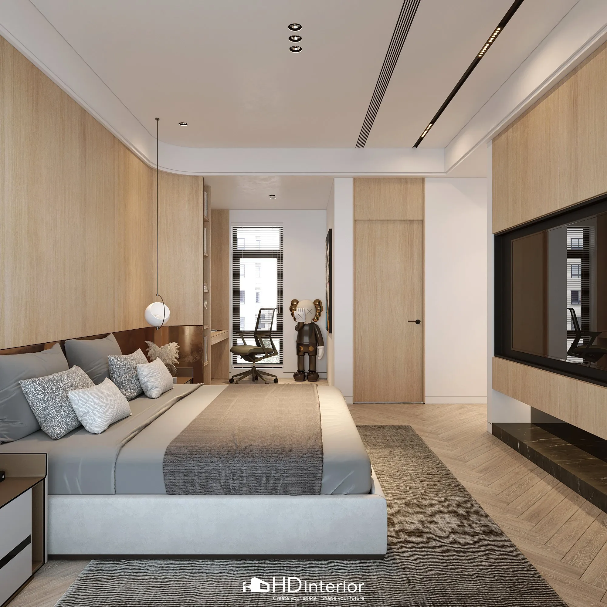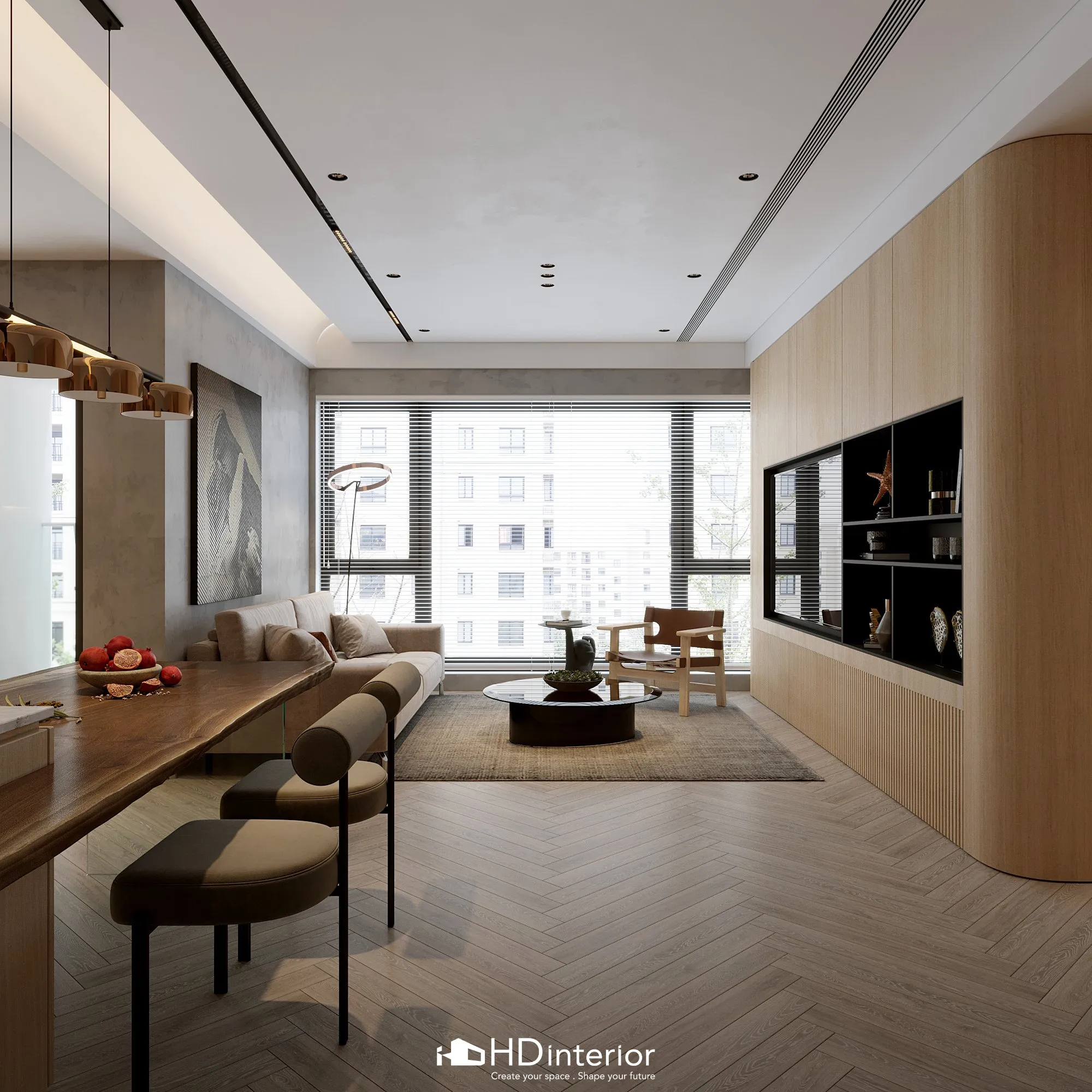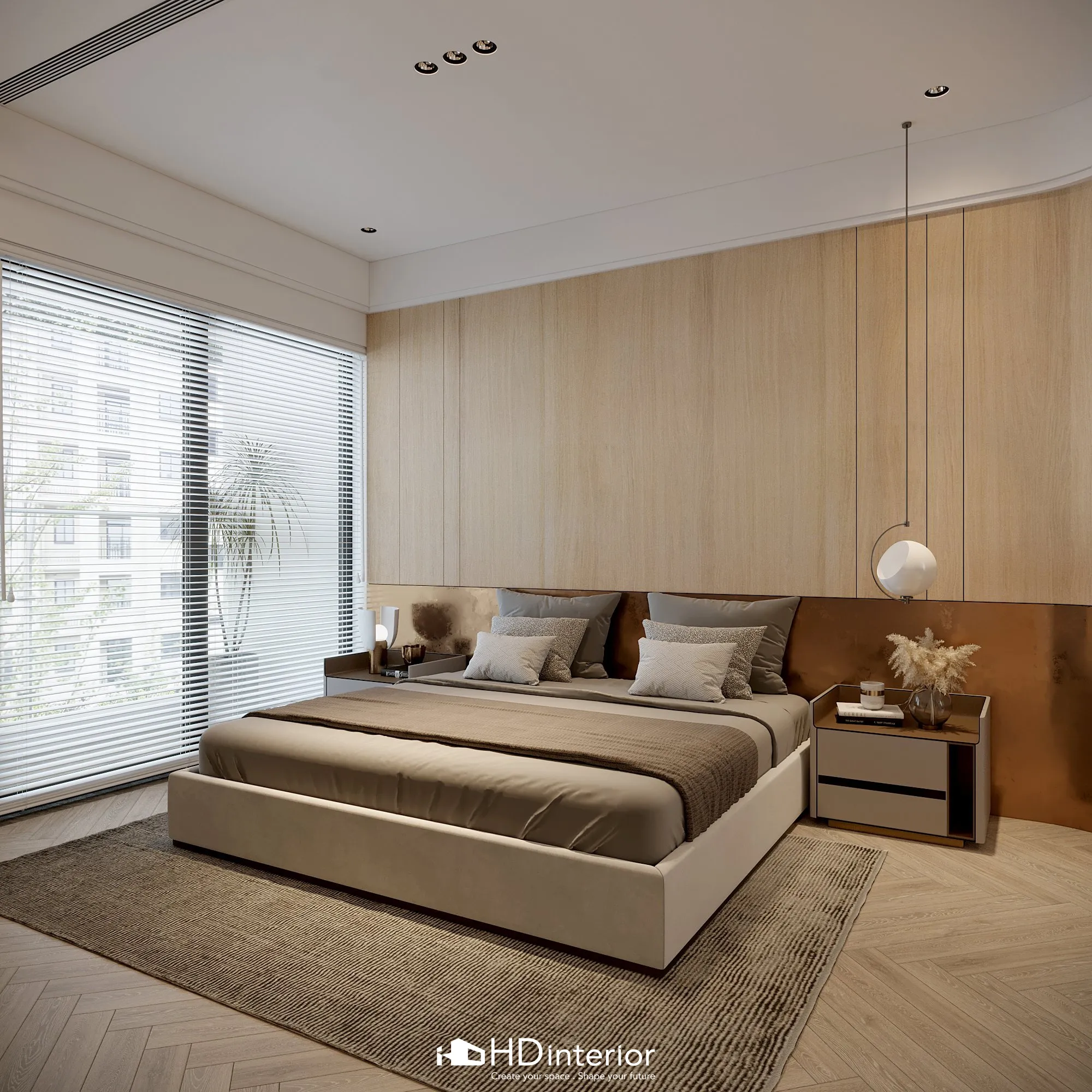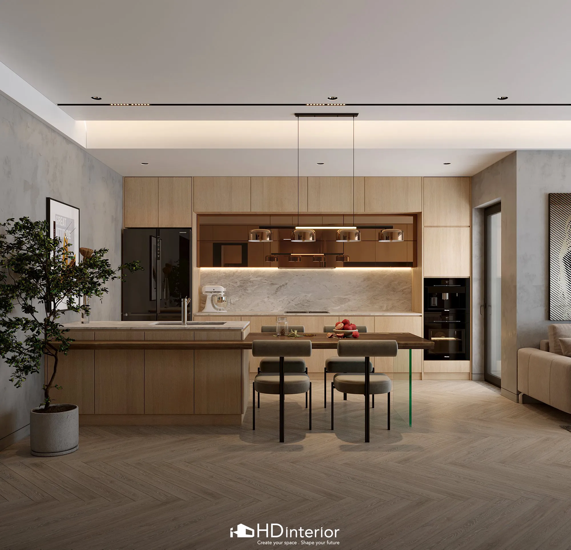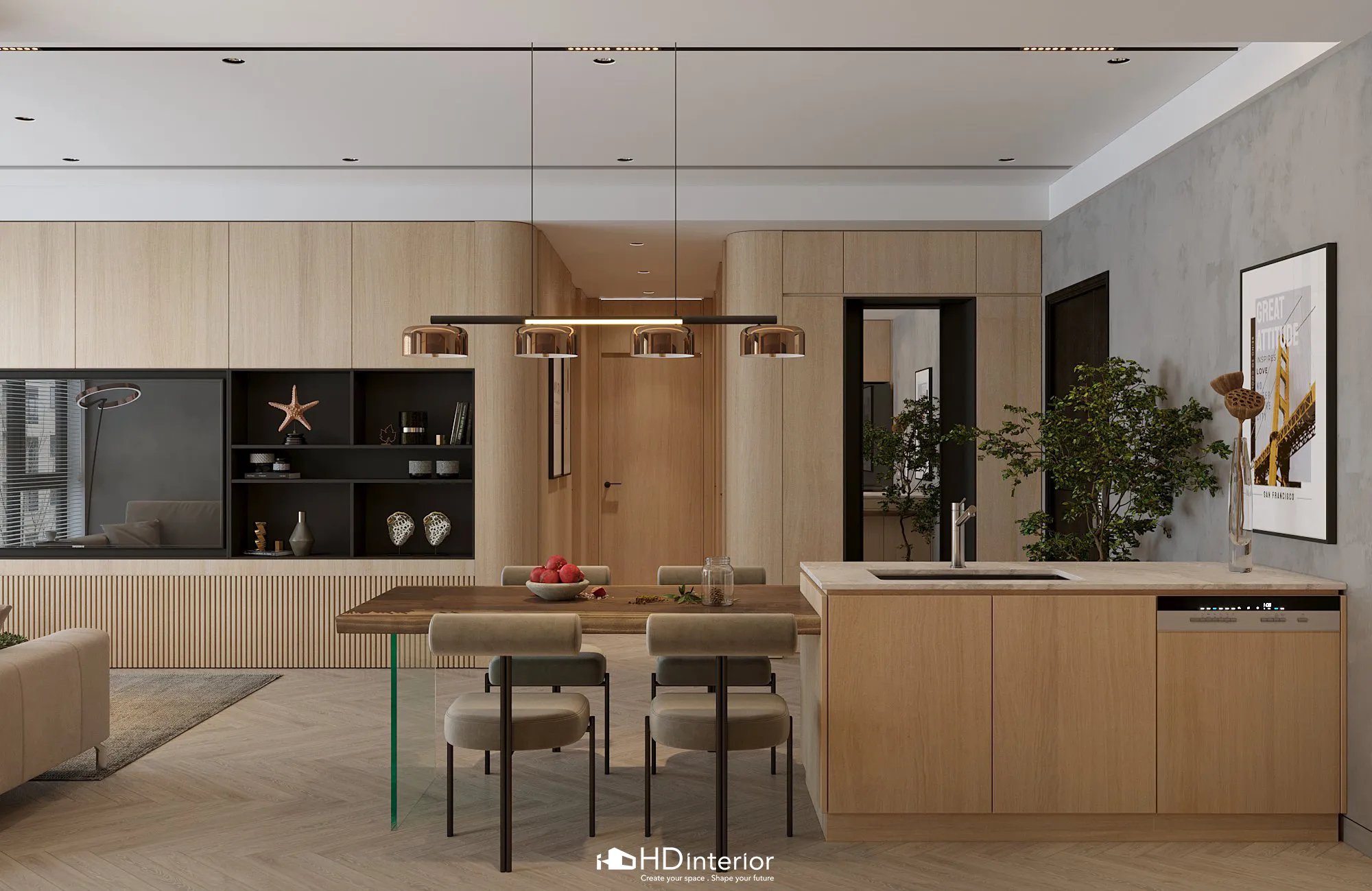 HD đã khéo léo sử dụng gam màu nâu nhạt vân gỗ cho tất cả các khu vực, tạo nên sự đồng nhất và tinh tế trong thiết kế. Lựa chọn thông minh này mang đến nhiều lợi ích cho không gian sống của gia chủ: