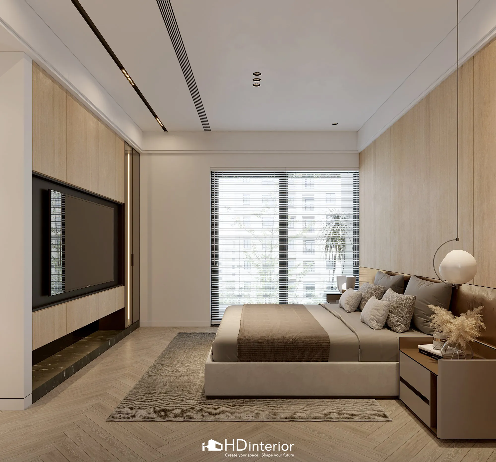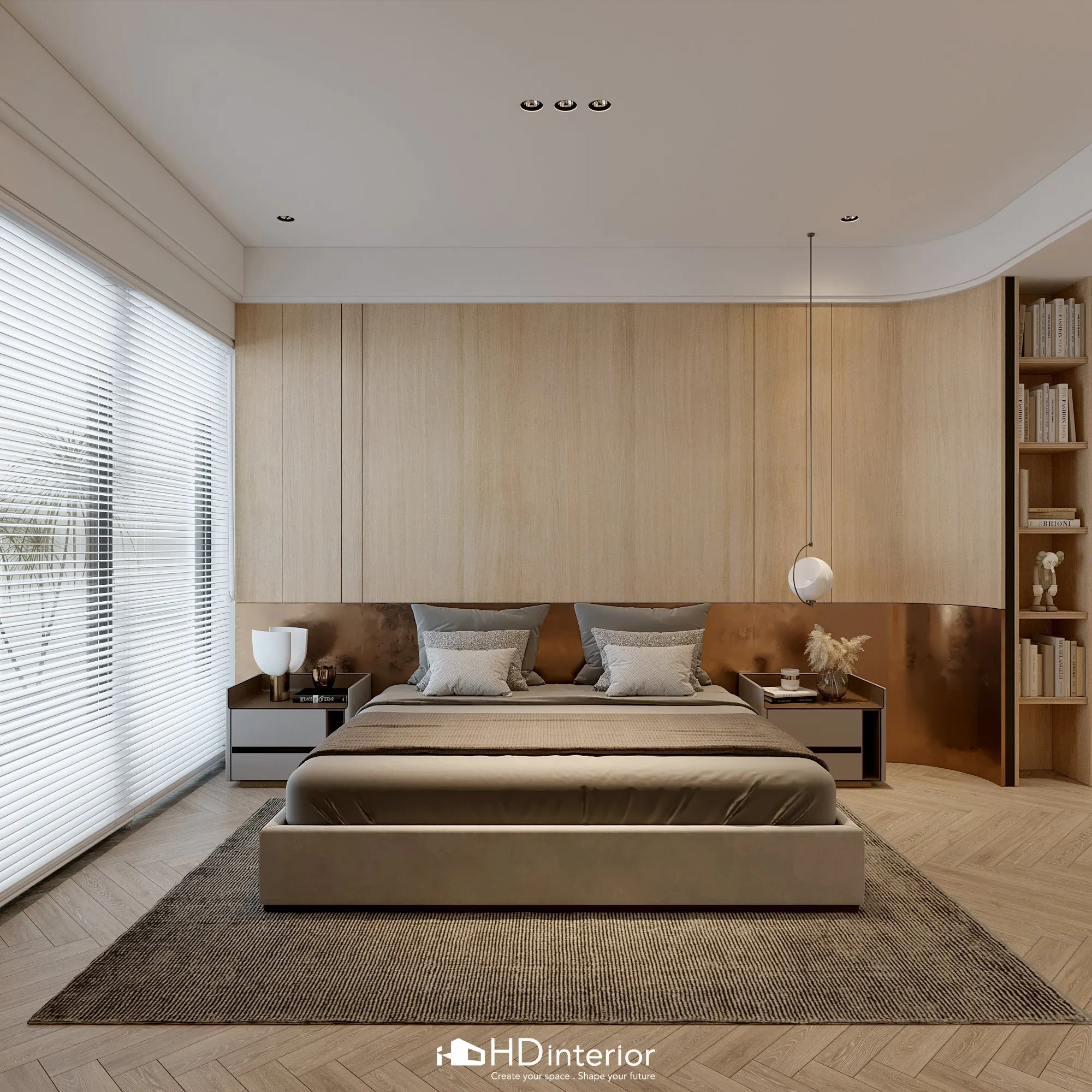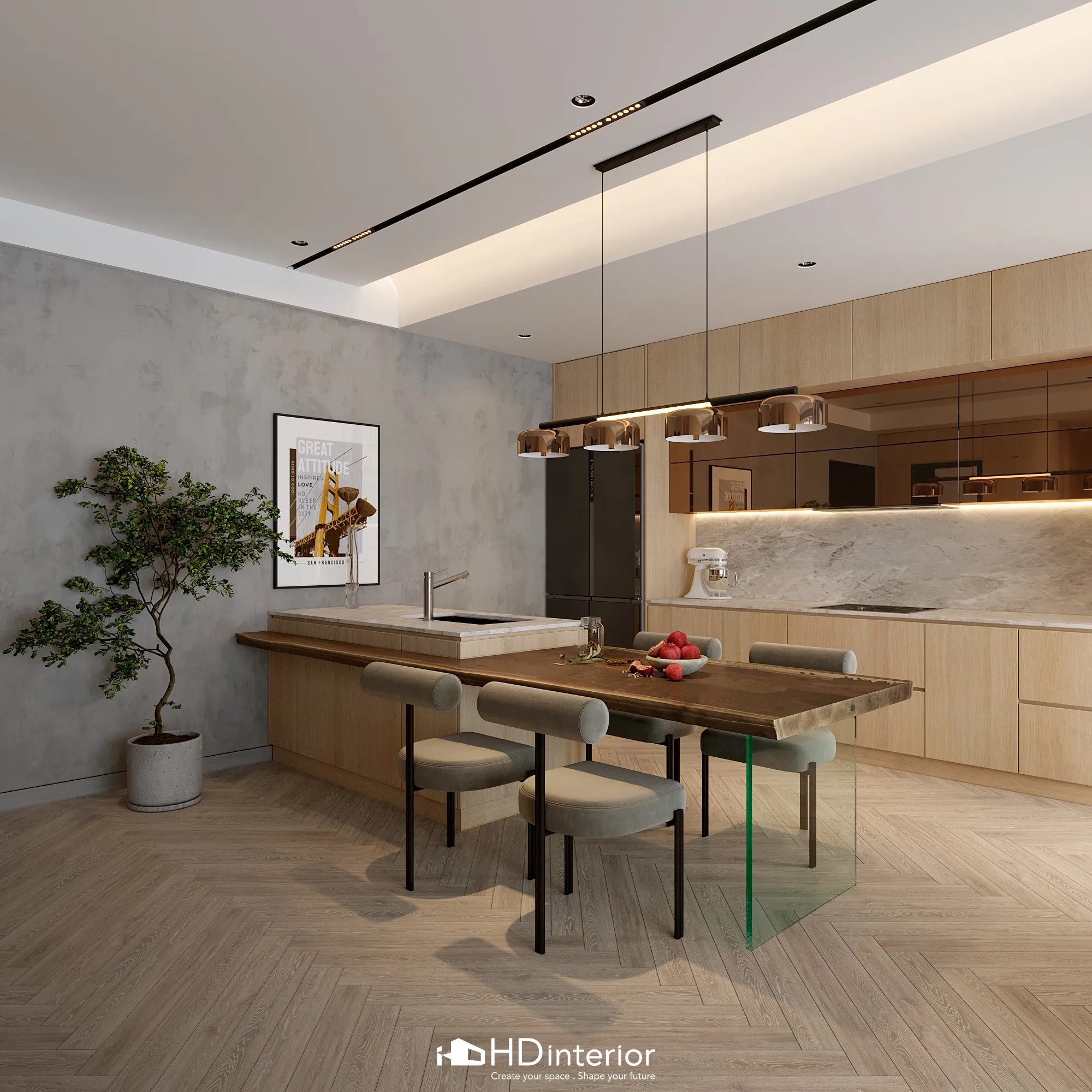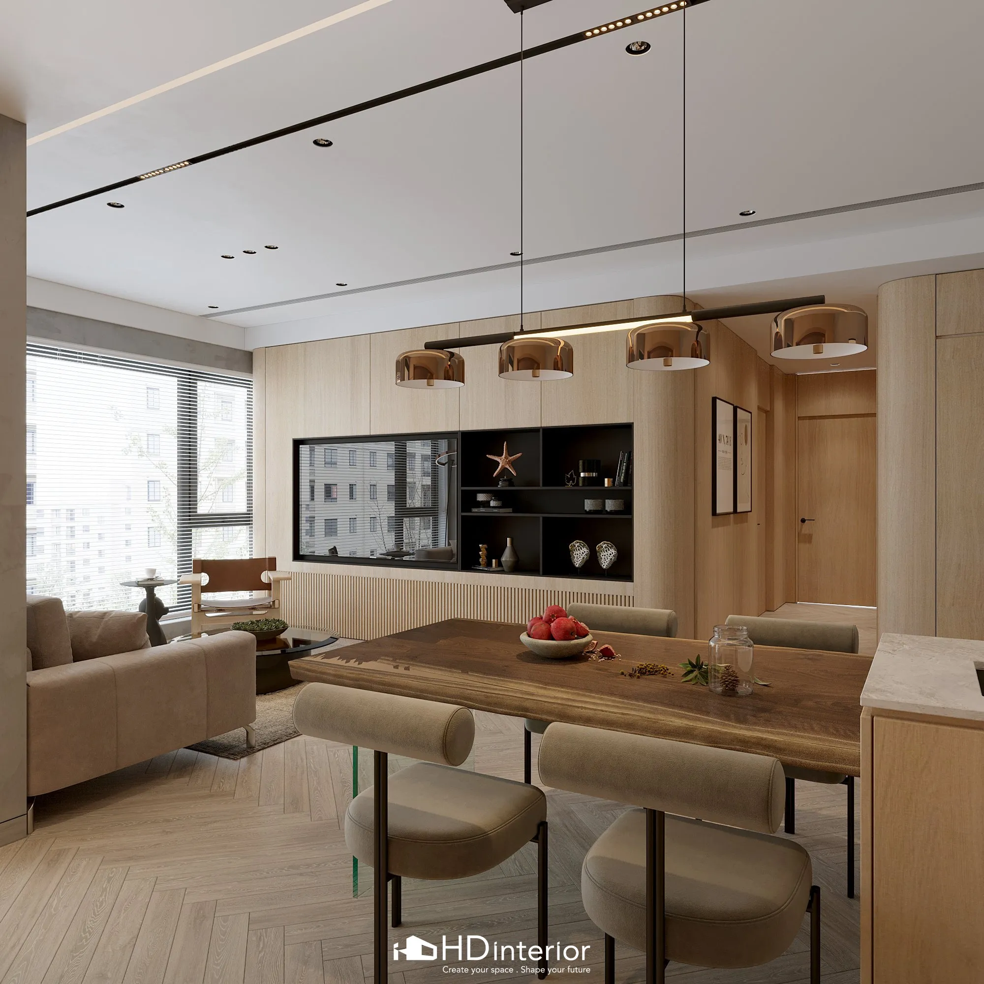 HD đã khéo léo sử dụng gam màu nâu nhạt vân gỗ cho tất cả các khu vực, tạo nên sự đồng nhất và tinh tế trong thiết kế. Lựa chọn thông minh này mang đến nhiều lợi ích cho không gian sống của gia chủ: