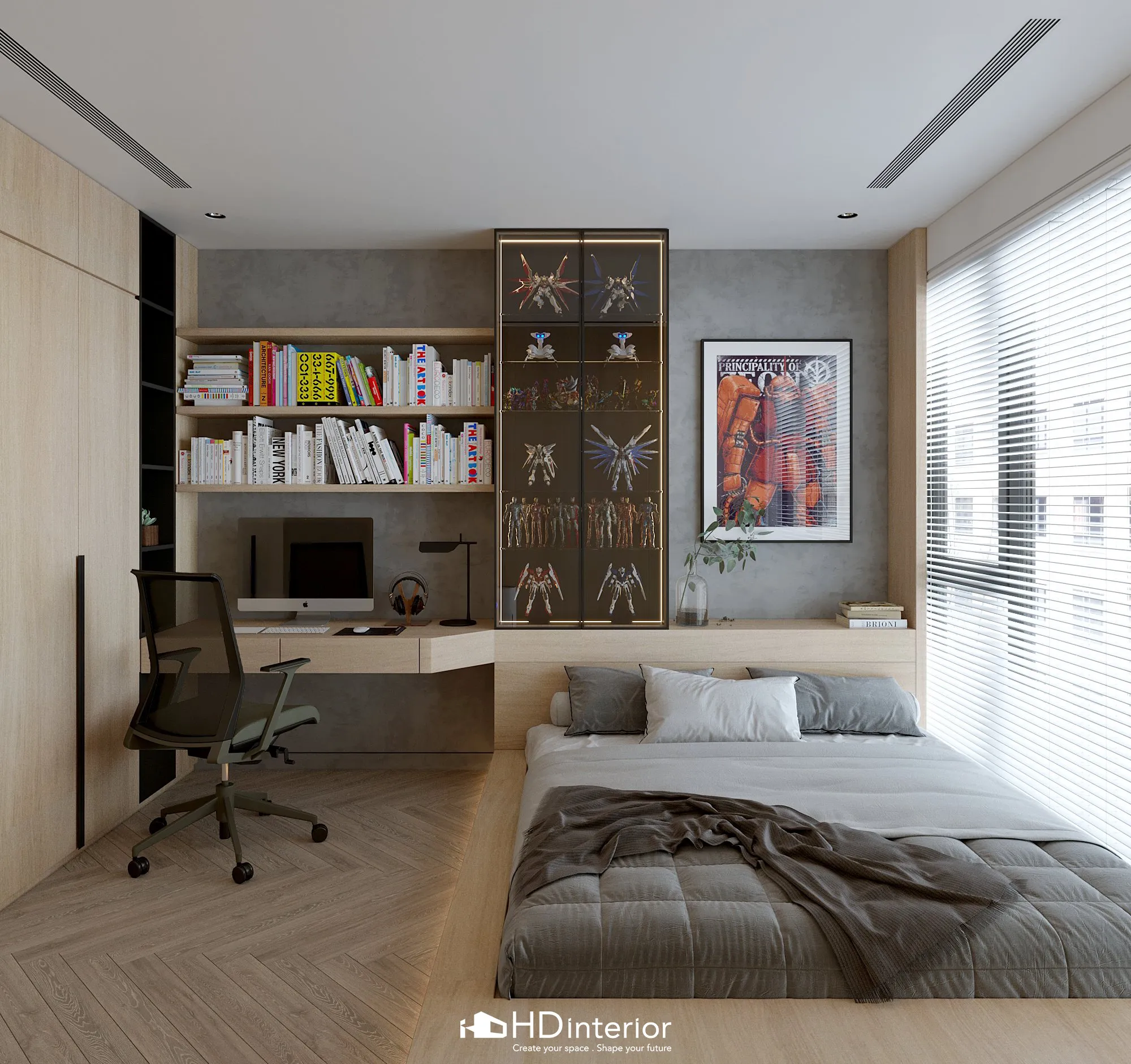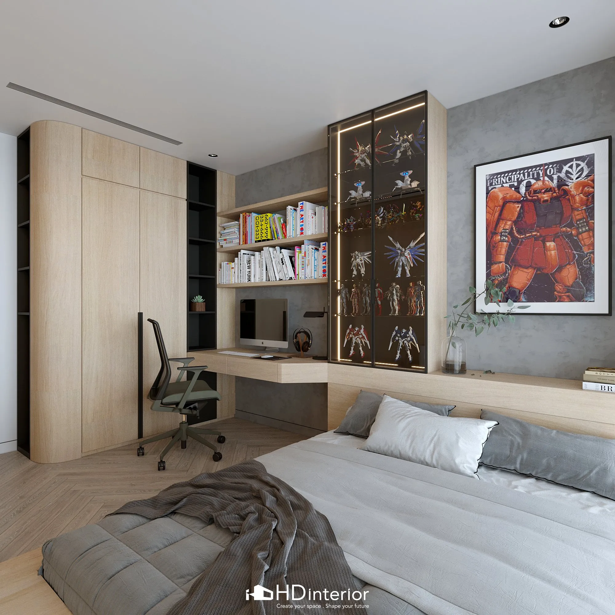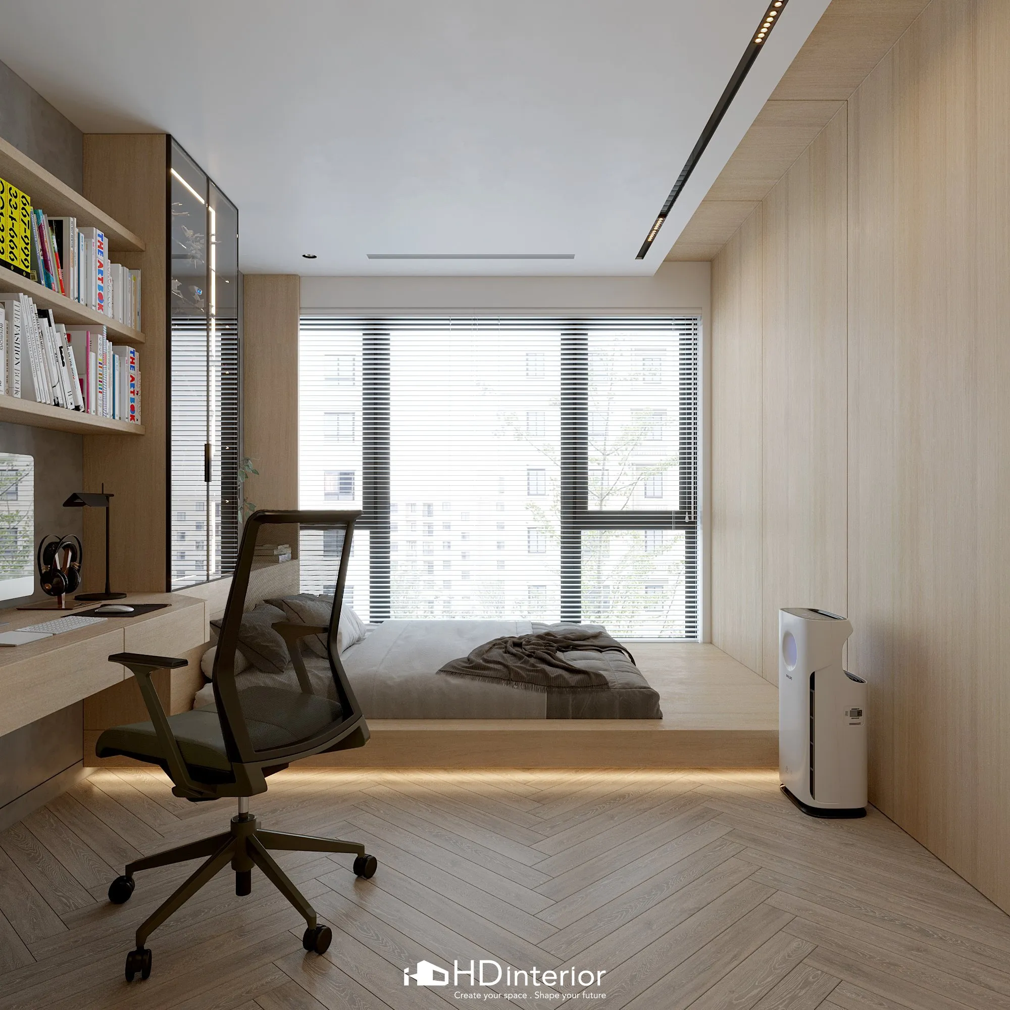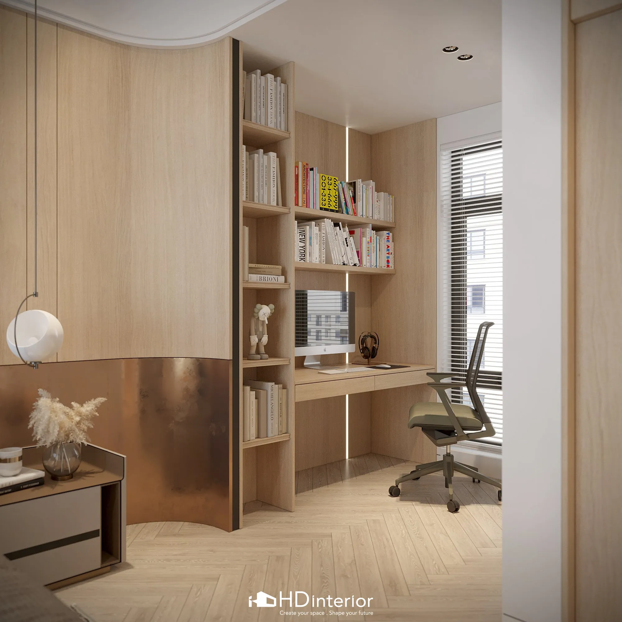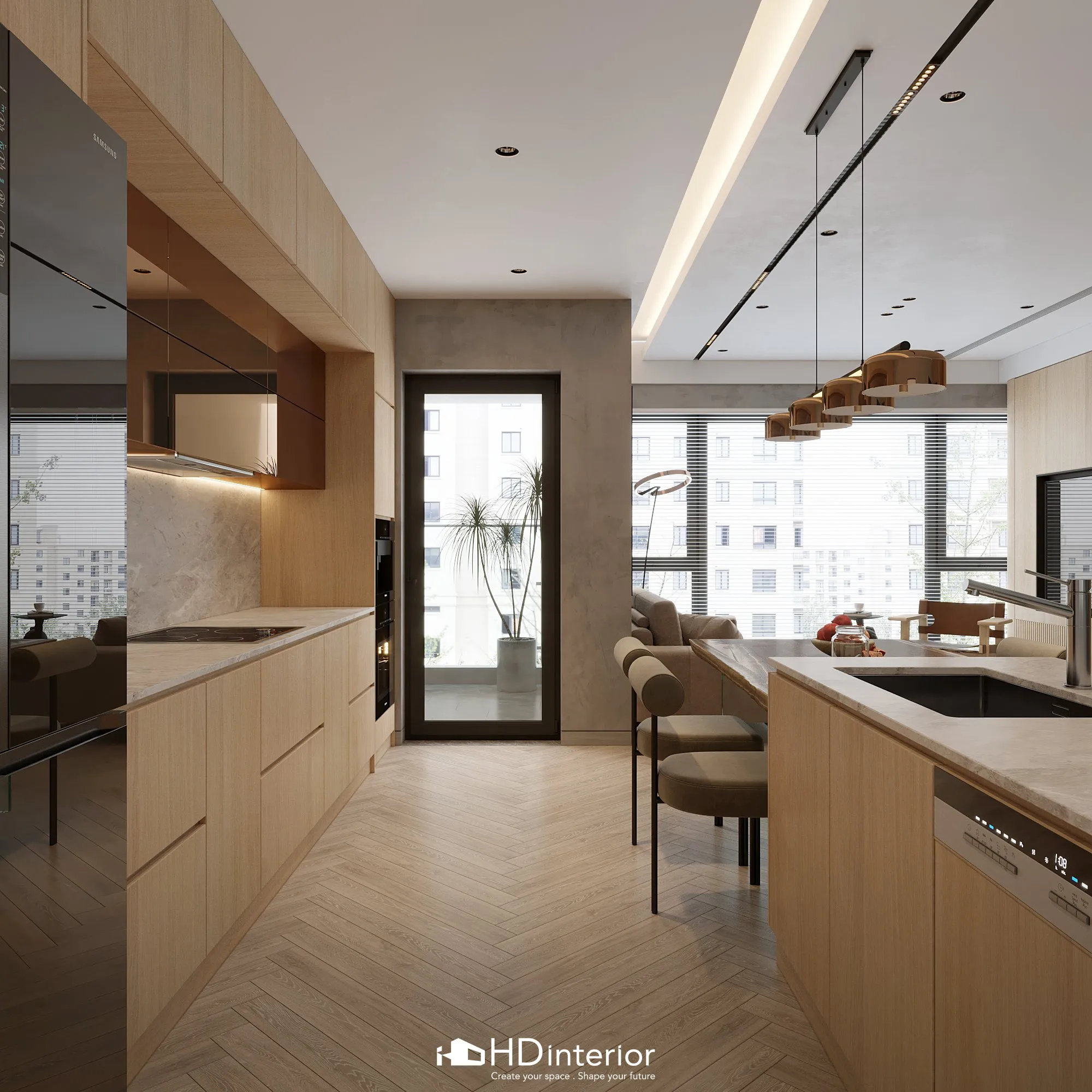 HD đã khéo léo sử dụng gam màu nâu nhạt vân gỗ cho tất cả các khu vực, tạo nên sự đồng nhất và tinh tế trong thiết kế. Lựa chọn thông minh này mang đến nhiều lợi ích cho không gian sống của gia chủ: